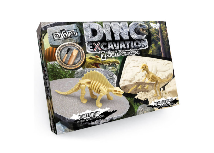 Набір для розкопок "DINO EXCAVATION". У цій коробці знаходиться пласт скам'янілої земної породи зі справжніми модельками скелетів динозаврів, а також археологічний набір інструментів, необхідних для розкопок. Барвиста інструкція допоможе правильно підійти до процесу розкопок і в захоплюючій ігровій формі розповість вам про деякі історичні факти, знайдених динозаврів! Після розкопки можна зібрати фігурку динозавра. 2 скелета динозаврів: ДИМЕТРОДОН и ДИЛОФОЗАВР.