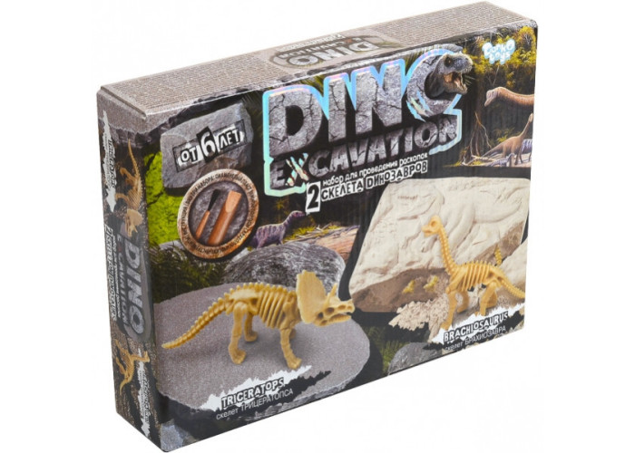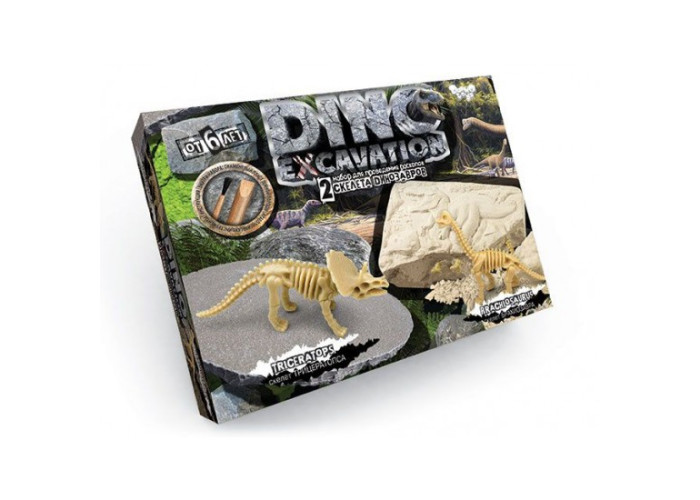 Набір для розкопок "DINO EXCAVATION". У цій коробці знаходиться пласт скам'янілої земної породи зі справжніми модельками скелетів динозаврів, а також археологічний набір інструментів, необхідних для розкопок. Барвиста інструкція допоможе правильно підійти до процесу розкопок і в захоплюючій ігровій формі розповість вам про деякі історичні факти, знайдених динозаврів! Після розкопки можна зібрати фігурку динозавра. 2 скелета динозаврів: ТРИЦЕРАТОПС та БРАХІОЗАВР.