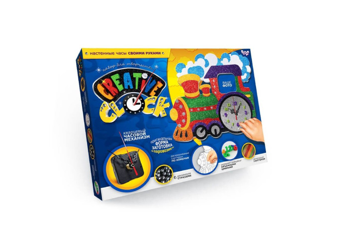 Комплект страз; Набор разноцветного глиттера; часовой механизм со стрелками; объемные разноцветные цифры на самоклейке; петелька для крепления; инструкция.