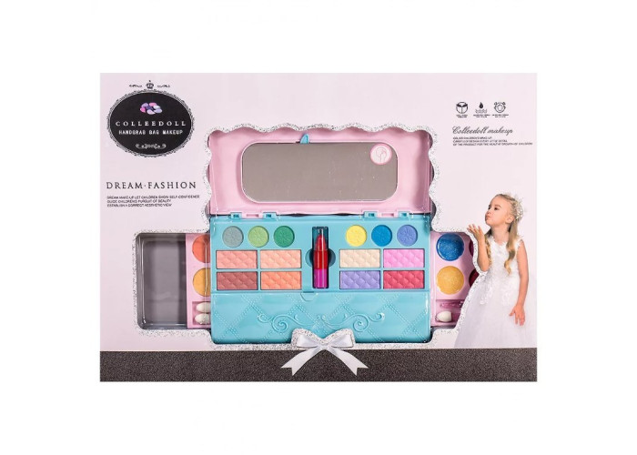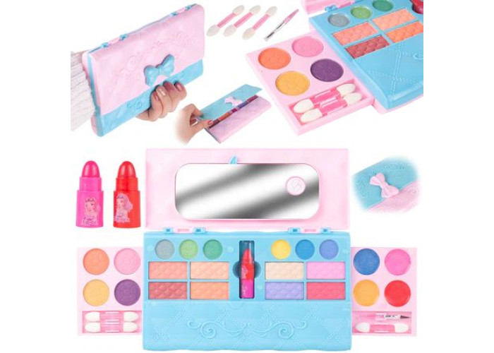 Набір косметики для дівчаток у сумочці — чудовий подарунок юній модниці для захопливих ігор і створення барвистих стильних образів. Комплект містить усі необхідні для цього косметичні засоби: помади, бальзами та блиски для губ, пензлики, пудра, а також палетка тіней для повік.