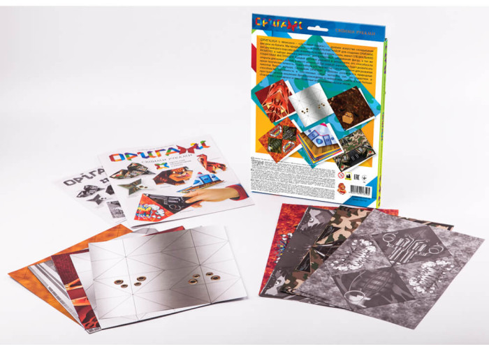 У набір входить кольоровий папір зі згинами для складання орігамі та інструкція.