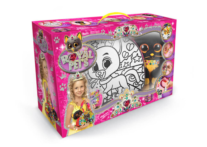 ROYAL PET'S - це не просто набір для дитячої творчості, а королівський подарунок для справжньої принцеси, який містить п'ять предметів: 1. Створи свій власний і неповторний стиль, прикрасивши дві сторони сумочки акриловими фарбами та декоруючи малюнок різнокольоровими кристалами. 2. Мила плюшева іграшка стане справжньою подружкою юної принцеси та вірним консультантом у світі моди. 3. Блискуча корона сяятиме і прикрашати юну леді. 4. Браслетик, декорується своїми руками, підкорить оточуючих своїм блиском і унікальним дизайном. 5. Ви будете виглядати дуже стильно і модно, завдяки королівським аксесуарам. Зроби нашийник для свого вихованця в стилі браслета. «ROYAL PET'S» - каприз юної принцеси!