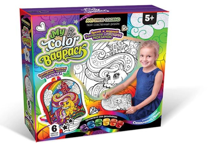Для юної рукодільниці комплект креативної творчості "My Color BagPack" рюкзак-розмальовка - це можливість блиснути своїми талантами, а ще провести час цікаво і з користю для справи. Для того щоб все вийшло, тут є абсолютно все необхідне. Це основа - невеликий рюкзак з нанесеним малюнком, який треба буде розфарбувати в техніці «антистрес». Також тут є фарби (шість баночок), акриловий лак, блискітки і пензлик. Якщо малятко постарається, проявить старанність, посидючість, увагу і все зробить акуратно, то у неї з'явиться дуже модна і красива річ.