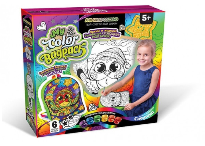 Набір для творчості "My color BagPack" - це рюкзак із зображенням, який можна розфарбувати глітером і фарбами, що входять в комплект набору. Поступово, завдяки старанню дитини, проста сумочка при оздобленні глітером фломастерами перетворюється в кольорове витвір.