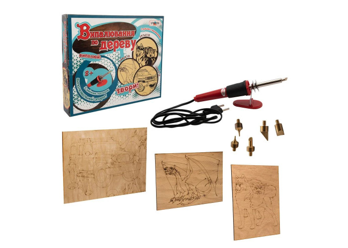 Набір для творчості "Випалювання по дереву" від ТМ Strateg пропонує дитині освоїти прийоми декоративно-ужиткового мистецтва. Набір буде цікавим дітям від 8+. У ньому є випалювальний прилад, 3 дерев'яні дошки різного розміру з малюнками, змінні насадки (5 штук). Розмір однієї великої дошки: 29,7 х21 см. Розміри двох маленьких: 14,8 х21 см.