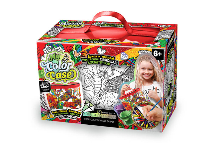 "My color case" - це унікальний набір креативної творчості у вигляді розписної косметички, який сприяє розвитку художніх здібностей, почуття кольору та гармонії у дитини. Веселка яскравих відтінків у поєднанні з сяючим блиском, відкриє казковий світ творчості без кордонів і дозволить повною мірою розкрити талант юної дівчинки!