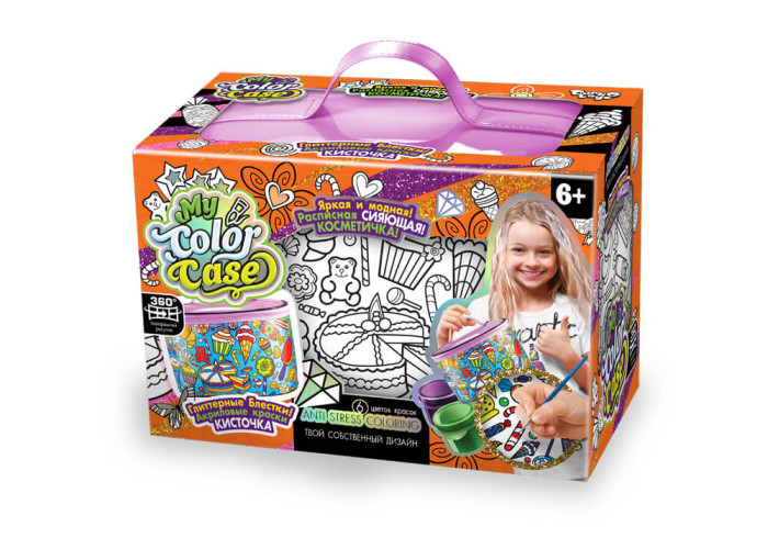 "My color case" - це унікальний набір креативної творчості у вигляді розписної косметички, який сприяє розвитку художніх здібностей, почуття кольору та гармонії у дитини. Веселка яскравих відтінків у поєднанні з сяючим блиском, відкриє казковий світ творчості без кордонів і дозволить повною мірою розкрити талант юної дівчинки!