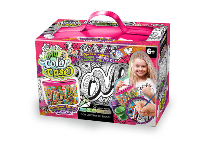 "My color case" - це унікальний набір креативної творчості у вигляді розписної косметички, який сприяє розвитку художніх здібностей, почуття кольору та гармонії у дитини. Веселка яскравих відтінків у поєднанні з сяючим блиском, відкриє казковий світ творчості без кордонів і дозволить повною мірою розкрити талант юної дівчинки!