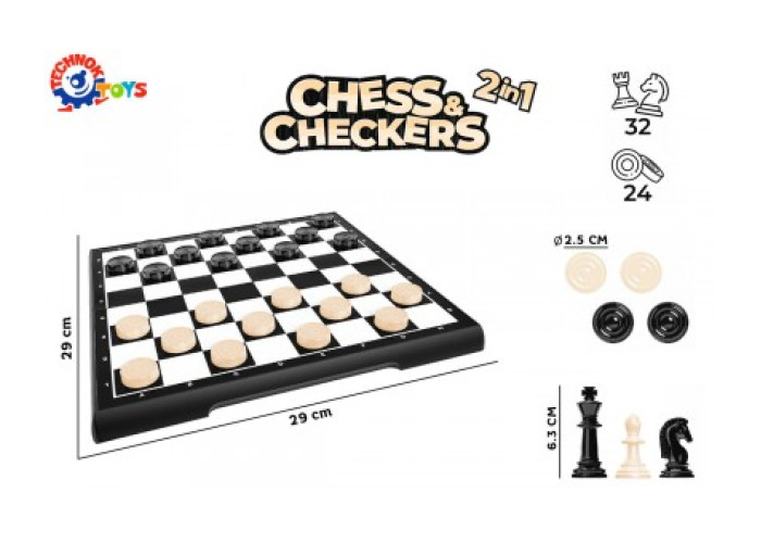Комплектація: пластикова коробка з металевим полем, шахи – 32 фігури, шашки – 24 шт.