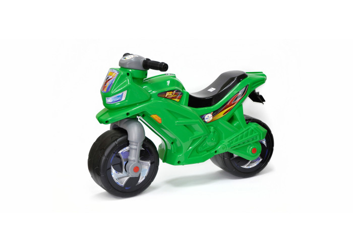 Дитячий двоколісний музичний мотоцикл-беговел виготовлений в зеленому кольоровому варіанті.
