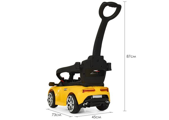- Розміри толокара: довжина машини/з батьківською ручкою - 74см/98см, ширина по дзеркалах/по колесах - 45см/35см, висота до батьківської ручки - 87 см