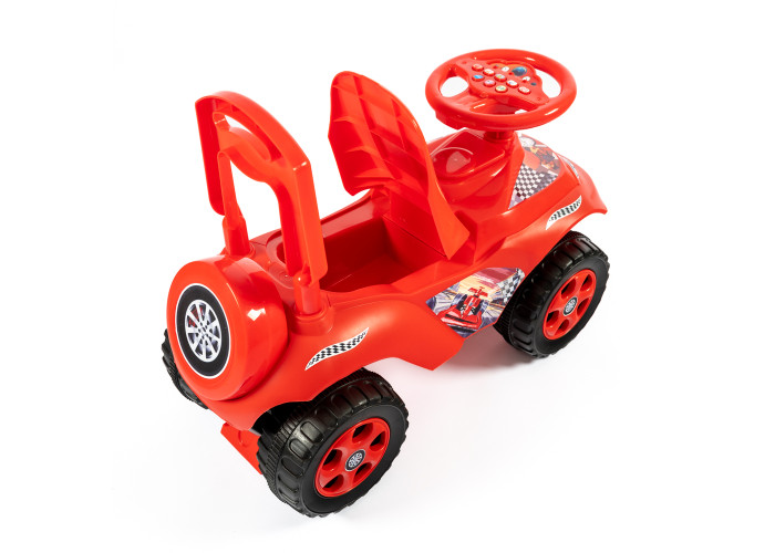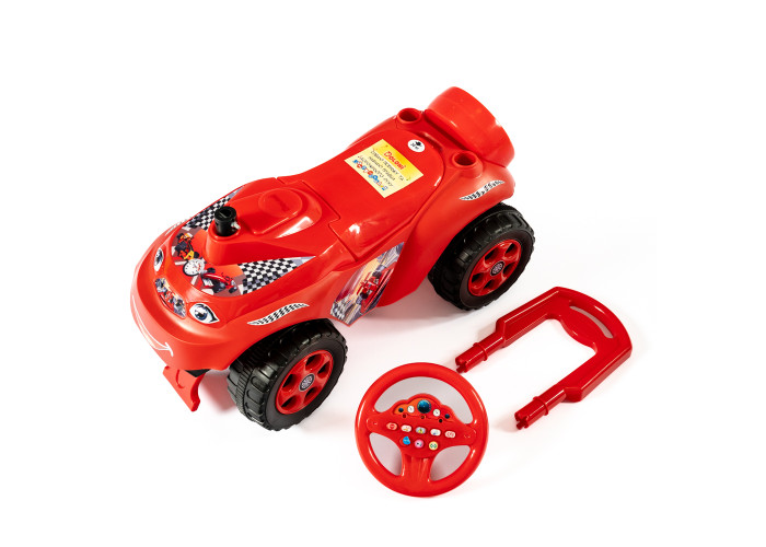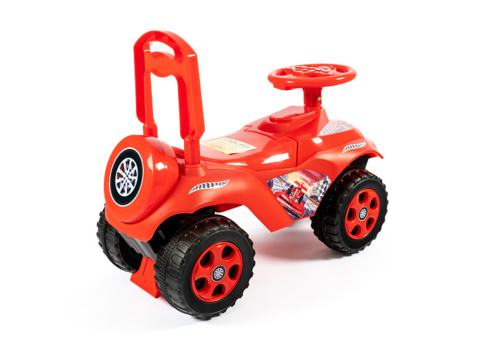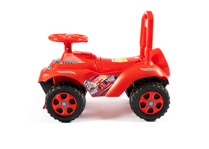 Автомобіль-каталка для пустотливих діточок, які люблять грати на свіжому повітрі. Яскравий дизайн та забарвлення робить іграшку привабливою для дитини! У задній частині навіть створено імітацію запасного колеса. Автомобіль каталка виготовлений і міцного та абсолютно безпечного пластику, конструкція стійко стоїть на землі. Широкі колеса надають стійкості машинці, а передній та задній упори не дадуть дитині перевернутись.