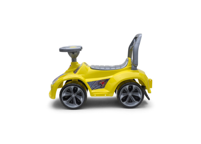 Руль игрушки, в виде неполного кольца, устанавливается на рулевой колонке с помощью винта и гайки. В центре руля есть кнопка звукового сигнала. Колеса игрушки надежно закреплены на металлических осях и имеют декоративные колпаки. Основные детали игрушки производятся методом литья под давлением из полипропилена. Дополнительные технические характеристики: угол поворота руля вокруг вертикальной оси ±30º, высота сиденья – 250 мм, высота руля от пола – 370 мм. Максимально допустимая нагрузка – «30 кг».