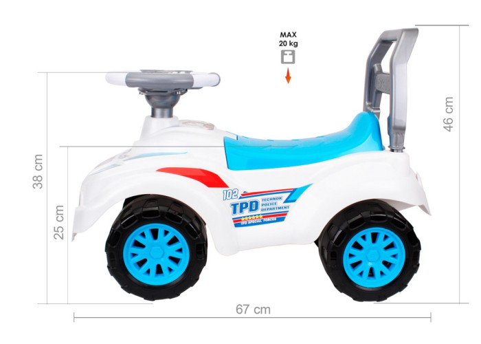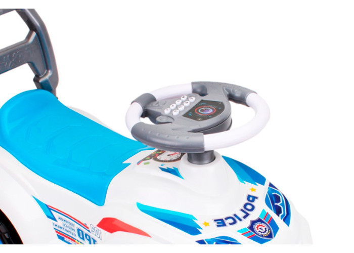 Яскраві кольори, "круті" наліпки, ергономічний дизайн і захопливі звуки та сигнали толокару неодмінно привернуть увагу малечі до іграшки. А нове електронне кермо принесе море радості Вашим малюкам під час катання на автомобілі. Вісім кнопок – це вісім різноманітних сигналів: запуск двигуна, різке гальмування, екстрені служби поліції, швидкої та пожежної допомоги, попереджувальний "фа-фа" і весела музика. Толокар надійний, міцний, практичний та зручний. Для перевезення всіх необхідних речей розроблено великий багажний відсік під сидінням .