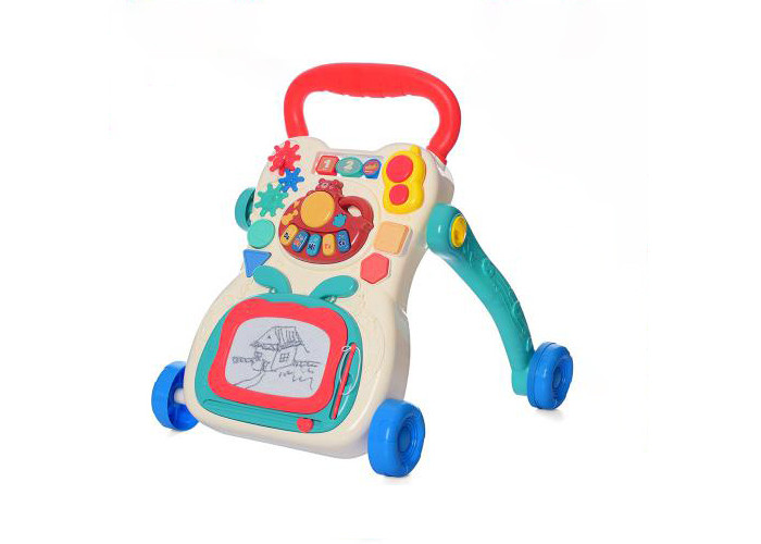 Якісний ігровий центр зі звуковими та світловими ефектами, із кумедними брязкальцями, безпечним дзеркальцем, різними елементами, що крутяться, сприяє розвитку звукового і слухового сприйняття у дитини, дрібної моторики, уяви, координації рухів, запам'ятовування різних звуків. А найголовніше, за допомогою ходунків дитина в ігровій формі навчиться робити перші кроки та почне впевнено ходити. Ігровий центр-каталка складається з наступних елементів: панелі, що розвиває, з кнопками і зображеннями тварин, важелями, крутних і дзвінких елементів, безпечного дзеркальця і цікавої книжечки. У комплекті є легкознімні іграшки: міні-піаніно, телефон-піщалка, дошка для малювання.