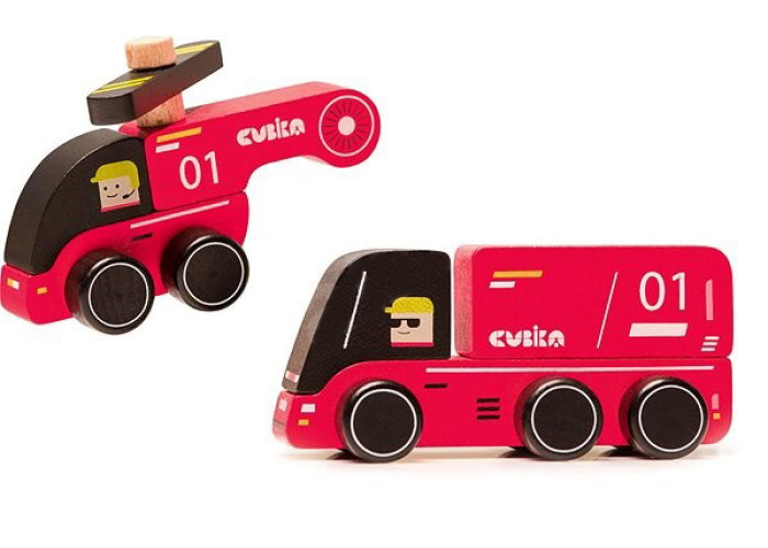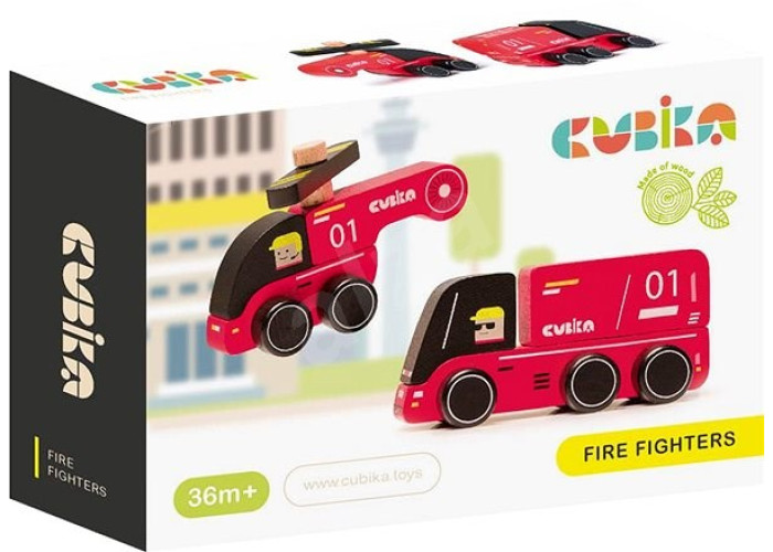 - Дерев'яний розвиваючий Набір "Пожежні" Левеня Cubika складається з пожежної машини та вертольоту.