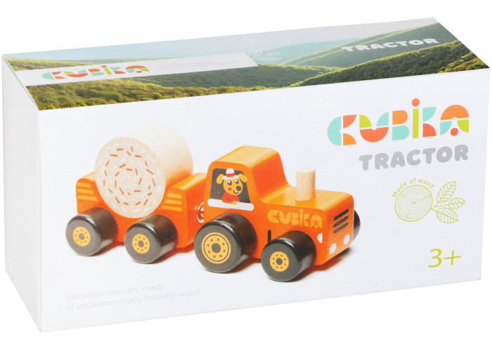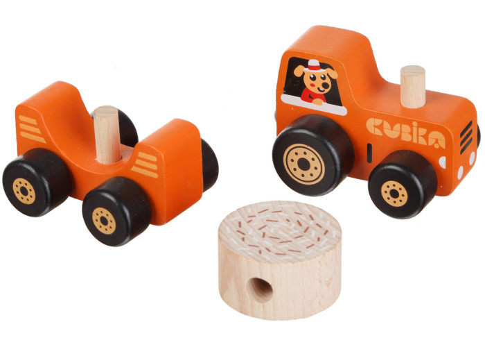 - Дерев'яна розвиваюча іграшка "Трактор" на магнітах Левеня Cubika складається з трактора і причепа, які кріпляться між собою на магнітах.