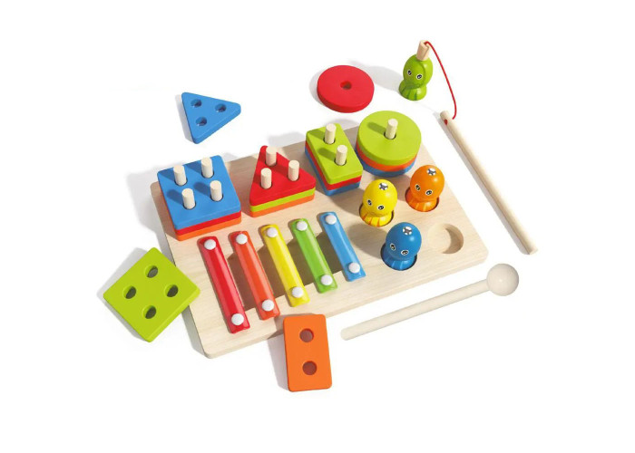 - БАГАТОФУНКЦІОНАЛЬНА РОЗВИВАЮЧА ІГРАШКА - дерев'яна дошка 4-в-1 - це унікальна іграшка, яка поєднує в собі безліч елементів для розвитку різноманітних навичок дитини. Вбудовані кілочки та блоки різної форми з отворами допомагають малюкам розвивати моторику рук та логічне мислення, вчать сортувати та співставляти форми.
