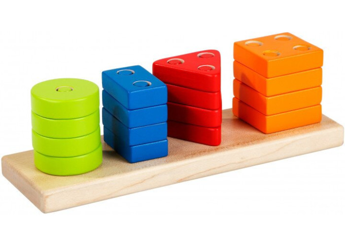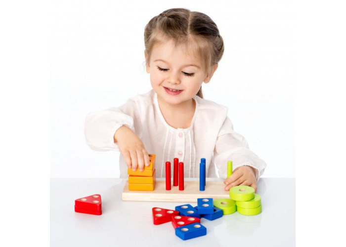 Геометричний сортер Cubika Прямокутник складається з основи і 16 різнокольорових геометричних фігур. Іграшка зроблена на основі класичної методикою Монтессорі, сприяє розвитку дрібної моторики і дозволяє швидко і ефективно навчити дитину базовим поняттям - колір, форма, сортування.