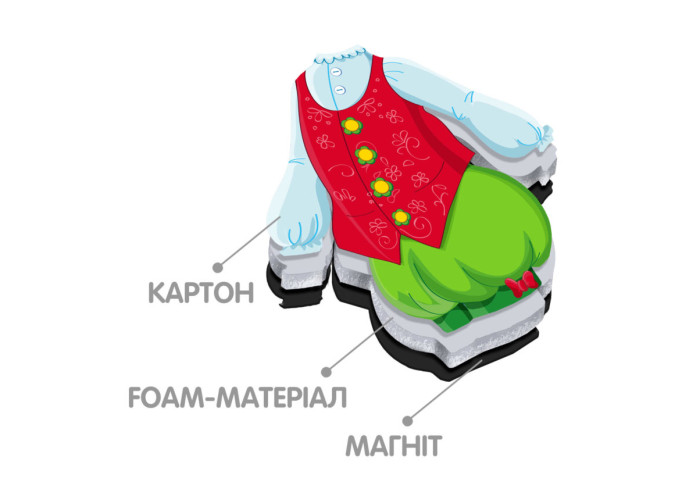 Комплектація: 2 ляльки, 27 магнітів (одяг та аксесуари), шафа для зберігання одягу, модний журнал.