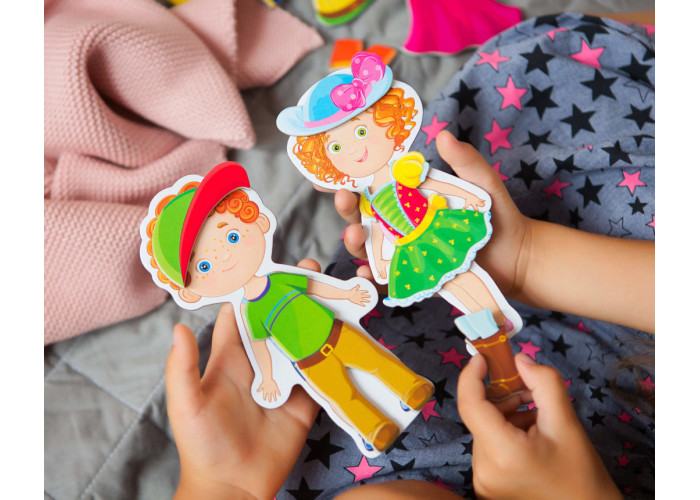 У наборі ви знайдете 2-х магнітних ляльок – хлопчика та дівчинку, а також різноманітні магнітні одяги та аксесуари для створення неперевершених образів. Переодягайте модників, комбінуйте предмети гардеробу. Але не забувайте скласти одяг у шафу після закінчення.