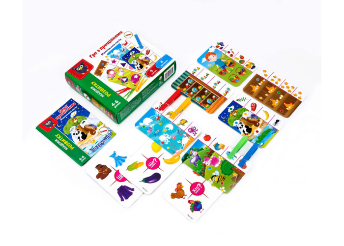 Комплектація: 4 прищіпки (червона, зелена, блакитна, жовта), 9 карток, інструкція.