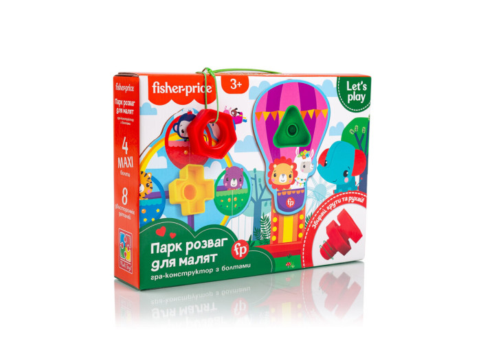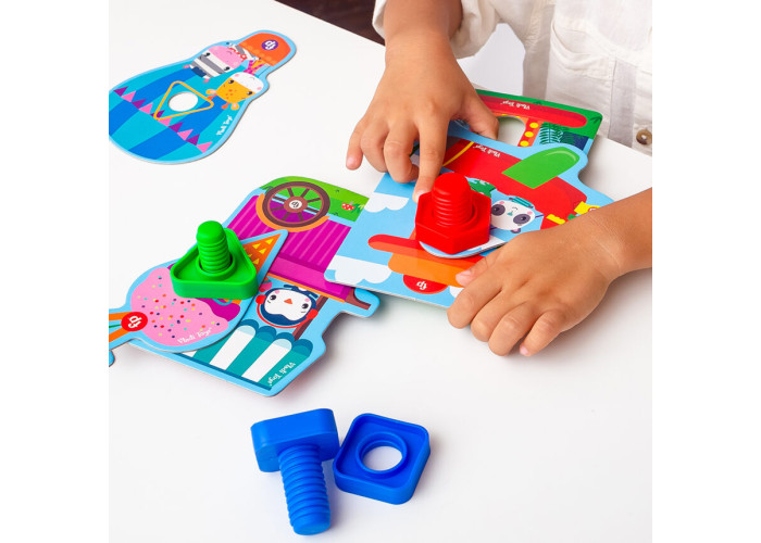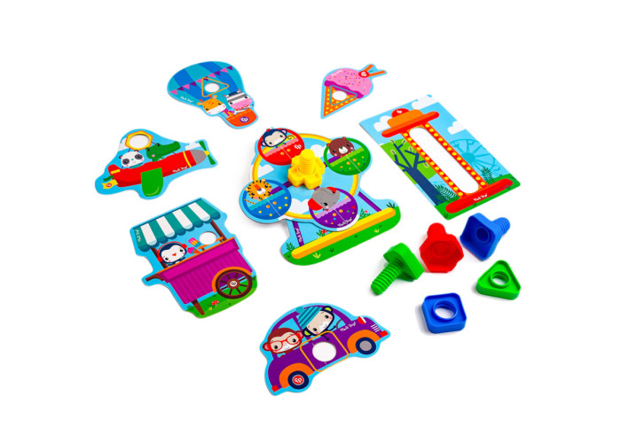 Розкладіть фігурні картонні деталі та пориньте у веселу атмосферу парку розваг. Візьміть болтики та зберіть за допомогою них атракціони. Щоб закріпити всі деталі, прикрутіть зверху гайки. Коли малюк закінчить, він зможе катати звірят.