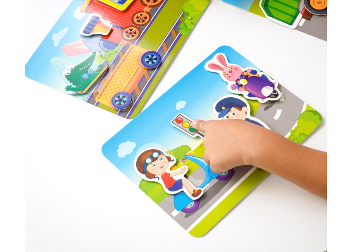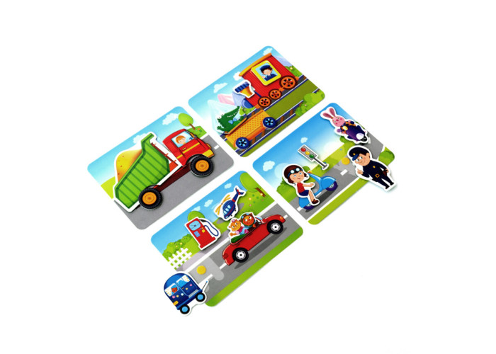 Наприклад, беремо картку із зображенням дороги. Кріпимо основу вантажівки на липучках. Потім додаємо кузов. Готово!