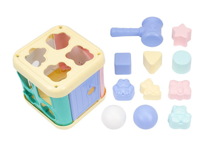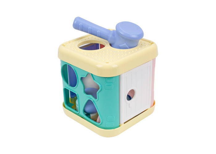 Куб має 6 сторін, різного кольору та форми. Дві сторони мають двері, які відкриваються в центр куба, відкриваючи геометричні форми та фігури тварин. Дитина може виймати фігурки і повертати їх у відповідні отвори. На іншій стороні є два отвори, куди дитина може забивати кульки за допомогою молотка. Дитина також може крутити шестерню на одній зі сторін.