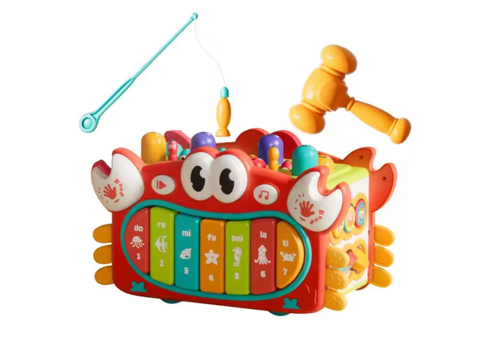 Цей багатофункціональний крабовий кубик має 6 граней та 12 інтерактивних ігрових функцій, включаючи гру «Удар крота», риболовлю, магнітну ловлю жуків, дитячі пісеньки, клавішне піаніно, барабани для малюків, обертання шестерень, перекидні таблиці здогадок, сортувальник фігур, розпізнавання чисел і часу, штовхання і тягнення та багато іншого. Забезпечте нескінченні розваги та просвітницьку освіту для немовлят.