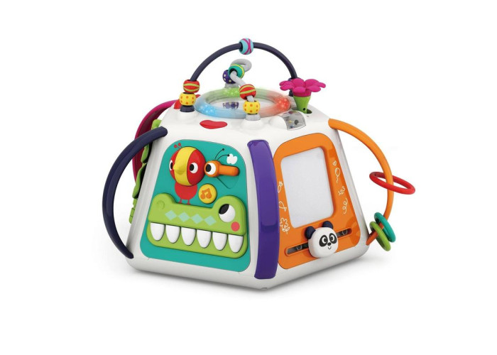 Ігровий центр надає дітям безліч цікавих пристроїв для ігор. Це і пальчиковий лабіринт, і дошка для малювання, і дзеркальце з підсвічуванням, і шестерні, що обертаються, і інші розвиваючі іграшки. Музичний мультибокс зі світловими ефектами – просто мрія для малечі від 18 місяців! У переддошкільному віці добре тренувати дрібну моторику, логічне мислення, виявляти творчі здібності. Ігровий мультибокс розвиває допитливість, м'язи рук та пальці, уяву та навички вирішення завдань. Кільця та намистини на лабіринті вчать розпізнавати форми та стимулюють дотик. Кругле дзеркало з кольоровим led-підсвічуванням знайомить малюка зі своїми емоціями. Слухові навички розвивають вбудовані брязкальця та панель із кнопками. Натискайте на пташка, метелика та зуби крокодила для прослуховування цікавих звукових ефектів. Кнопка з нотами програє веселі мелодії, всього 5. Відмінно тренує уяву та нестандартне мислення панель для створення візерунків. Квіти, хвилі та крапки немов пливуть чи рухаються завдяки оптичній ілюзії. Натисніть на сонечко і пограйте в «вгадай тварину за листочком» зі звуковими ефектами. Шестерні зі звірятами, якщо покрутити, теж «звучать» на п'ять різних ладів. На магнітній дошці для малювання накресліть ручкою-квіточкою щось і зітріть повзунком-пандою. Відмінний пристрій для тренування художніх навичок без плям і безладдя. Така кількість іграшок, що розвивають, має далеко не кожен ігровий центр. Дизайн у вигляді білої основи та різнокольорових деталей не перевантажує нервову систему малюка. Великий плюс дитячого мультибоксу - іграшки в ньому надійно закріплені, їх не потрібно збирати по всьому будинку.