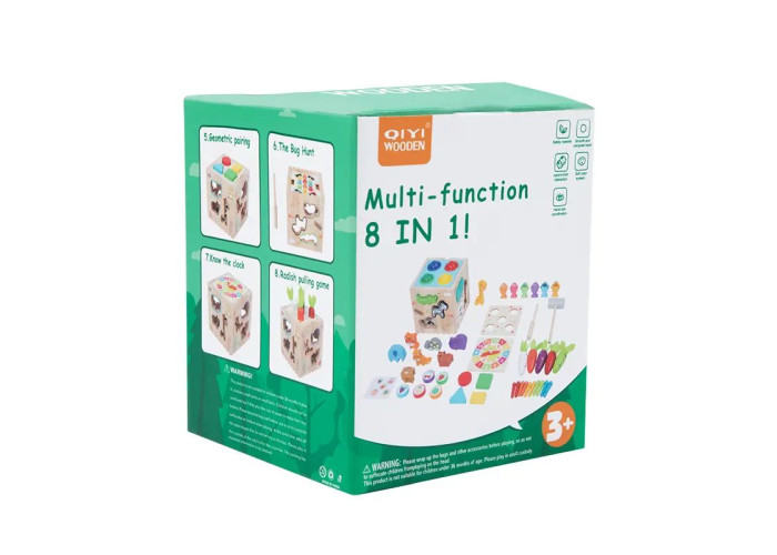 Це ідеальна дерев'яна іграшка 8 в 1. Такі іграшки розвивають інтелект і тренують органи чуття. Виховуйте та розважайтеся. Розкрийте талант, одночасно вправляйте зорово-моторну координацію та дрібну моторику, тренуйте силу рук та практичні навички. Чудова якість: Всі кути ретельно відшліфовані, він гладкий. Він виготовлений з дерева чудові візерунки та яскраві кольори.Практичний у використанні: Він широко використовується дітьми і може випереджати інших. Нехай малюки, вивчають форми та кольори, а також зорово-моторну координацію. Ця іграшка дозволяє їм виробити хорошу звичку зберігати та зберігати речі. Виховуйте у дитини навички зберігання речей і дозволяйте їй самій пакувати свої речі.