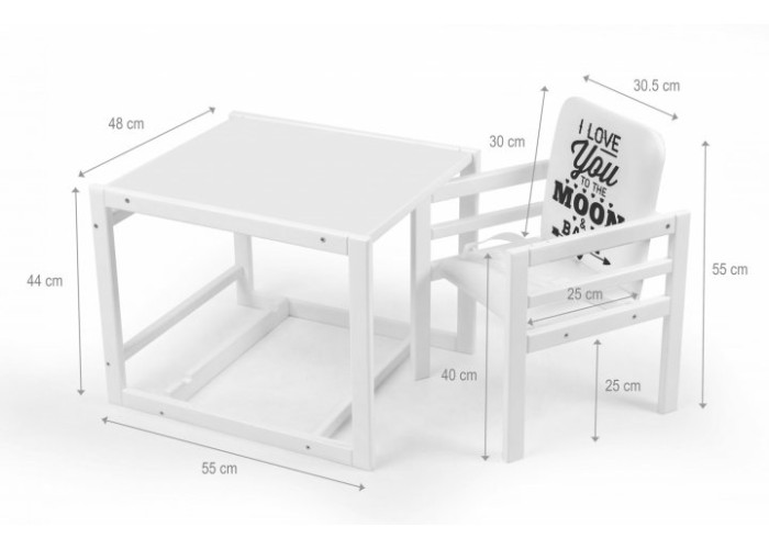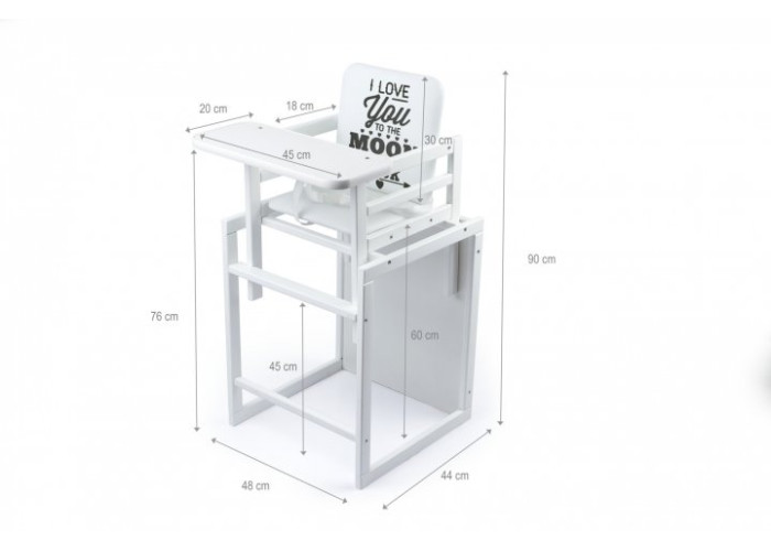 Стільчик для годування OMMI відрізняється високою якістю матеріалів, з яких він виготовлений. Всі видимі деталі заокруглені, ЛДСП з якої виготовлені стільниця і столик - оброблена якісним Т-профілем, і міцно зафіксована в пазах.
