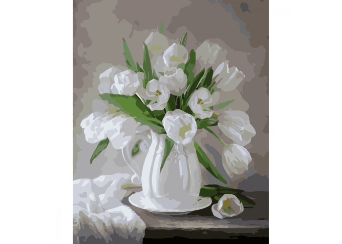 Картина за номерами "Букет білих тюльпанів" з лаком та рівнем від Strateg