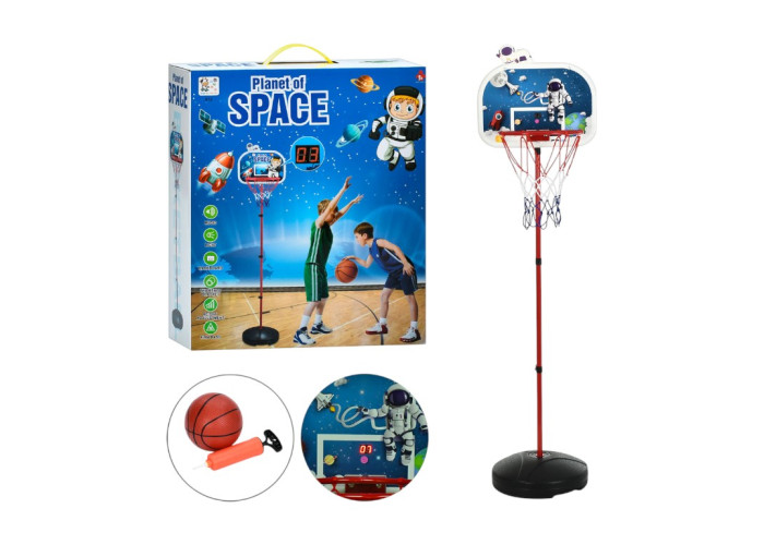Живлення здійснюється від батарейок, що забезпечує автономність та зручність використання. У комплект також входить баскетбольний м'яч та насос для швидкого накачування - все необхідне, щоб одразу розпочати гру після розпакування.