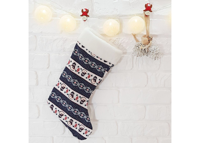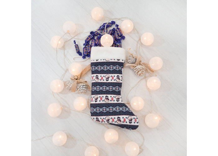 - цей святковий чобіток прикрасить ваш камін або будинок до Нового року. Порадує ваших близьких не тільки вмістом, але і красивим дизайном. Вміщує близько 1 кг цукерок. Виконаний з якісного трикотажу в новорічній тематиці.