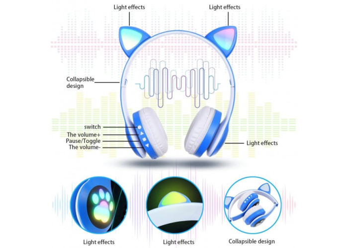 Бездротові навушники Bluetooth Cat відрізняються від більшості інших навушників маленькими котячими вушками. Даний дизайн користується особливою популярністю серед молодого покоління завдяки тому, що є підсвічування вушок та лапок.