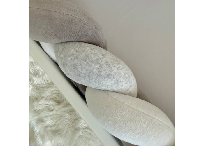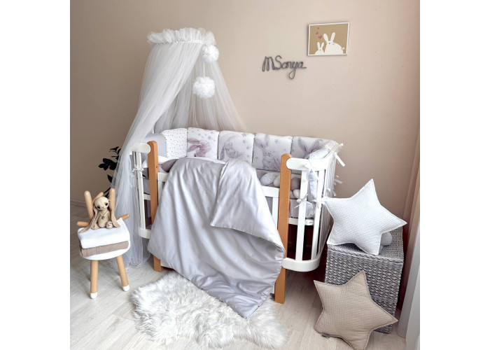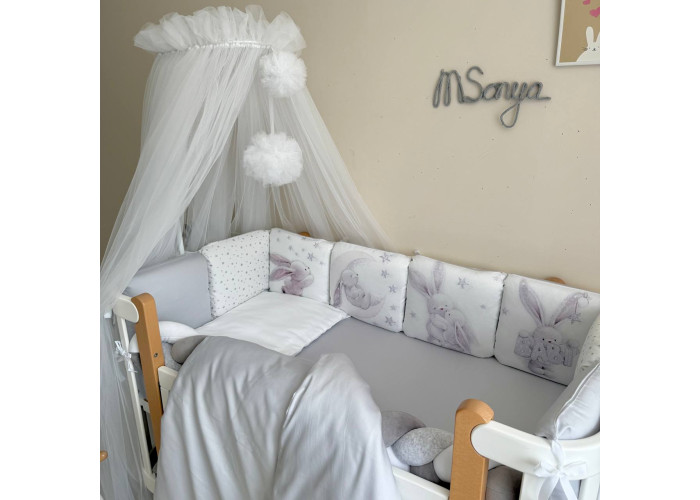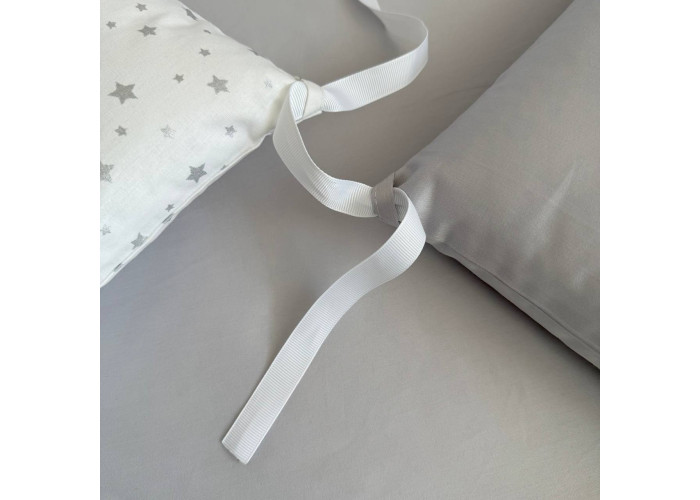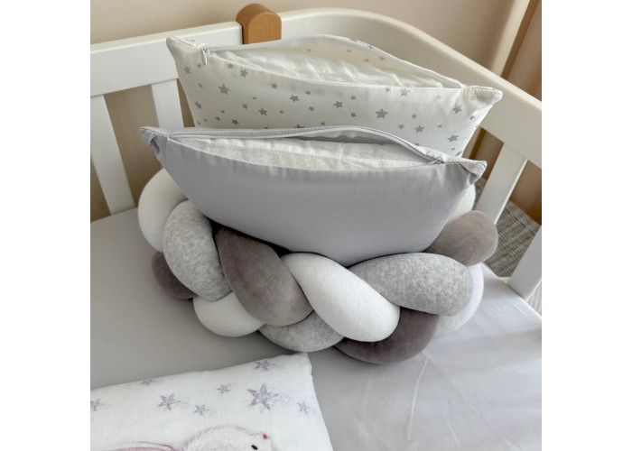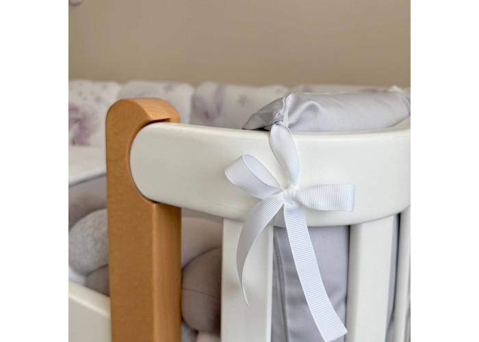 Підковдра, наволочка, простирадло, пошиті з натурального бавовняного матеріалу сатин. Простирадло на резинці ідеально повторює форму матраса в ліжечку. Наповнювач бортиків - силіконізоване волокно, наповнювач подушки, ковдри - штучний лебединий пух.