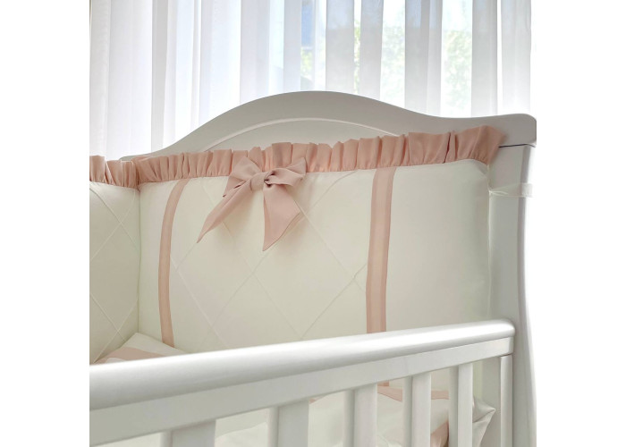 Підковдра, наволочка, простирадло, пошиті з натурального бавовняного матеріалу сатин. Простирадло на резинці ідеально повторює форму матраса в ліжечку. Наповнювач бортиків - силіконізоване волокно, наповнювач подушки, ковдри - штучний лебединий пух.