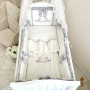 Підковдра, наволочка, простирадло, пошиті з натурального бавовняного матеріалу сатин. Простирадло на резинці ідеально повторює форму матраса в ліжечку. Наповнювач бортиків - силіконізоване волокно, наповнювач подушки, ковдри - штучний лебединий пух.