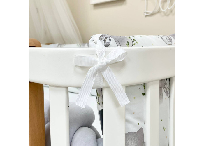Підковдра, наволочка та простирадло, пошиті з натурального бавовняного матеріалу попліна. Простирадло на гумці ідеально повторює форму матраца в ліжку. Ecotton - екологічно чистий, гіпоалергенний наповнювач, створений на основі натуральних бавовняних волокон. Ecotton полегшений та вдосконалений спеціально для виготовлення ковдр та подушок у ліжечко, на базі основних норм та вимог до постільних речей для новонароджених. Наповнювач бортиків - силіконізоване волокно.