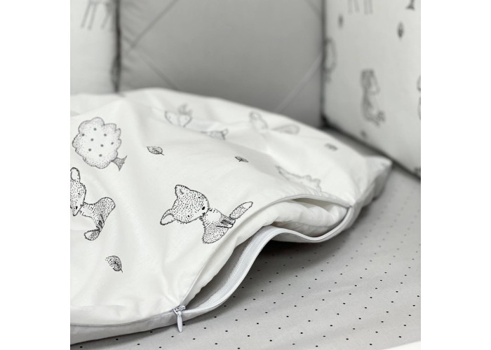Підковдра, наволочка та простирадло, пошиті з натурального бавовняного матеріалу попліна. Простирадло на гумці ідеально повторює форму матраца в ліжку. Ecotton - екологічно чистий, гіпоалергенний наповнювач, створений на основі натуральних бавовняних волокон. Ecotton полегшений та вдосконалений спеціально для виготовлення ковдр та подушок у ліжечко, на базі основних норм та вимог до постільних речей для новонароджених. Наповнювач бортиків - силіконізоване волокно.