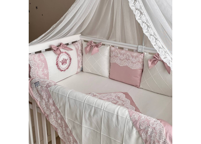 Комплект постільної білизни з 4 предметів (бортики, плед-конверт з ковдрою(сатин/Minky/вишивка/мереживо), бантик, простирадло).