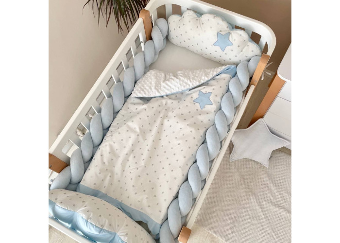 Комплект пошитий з натурального бавовняного матеріалу - попліна, бортики-коси -з велюру. Простирадло на гумці ідеально повторює форму матраца в ліжку. Наповнювач бортиків - холлофайбер, наповнювач ковдри - штучний лебединий пух.