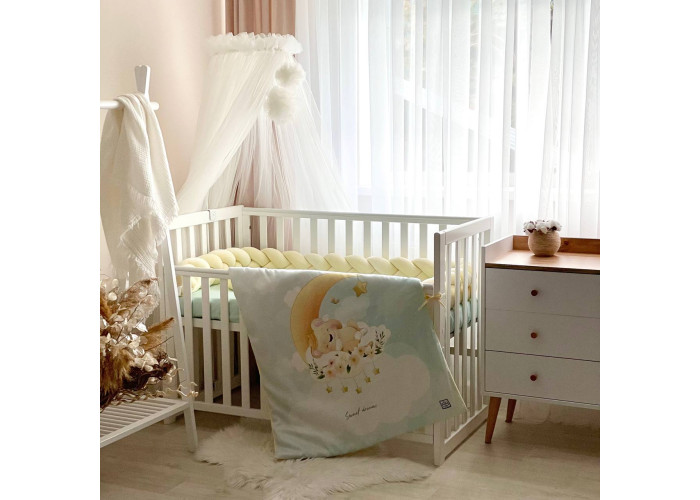 Комплект постільної білизни з 5 предметів (бортик-коса, анатомічна подушка, плед-конверт з ковдрою (сатин/велюр), бантик, простирадло).