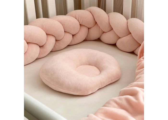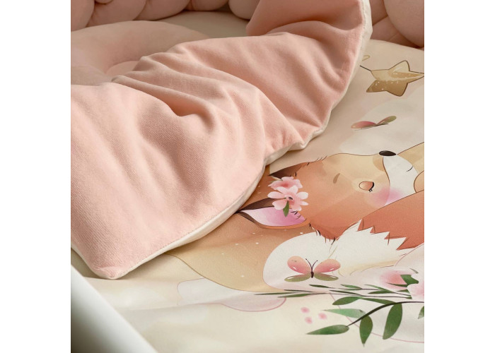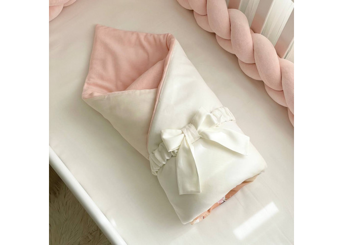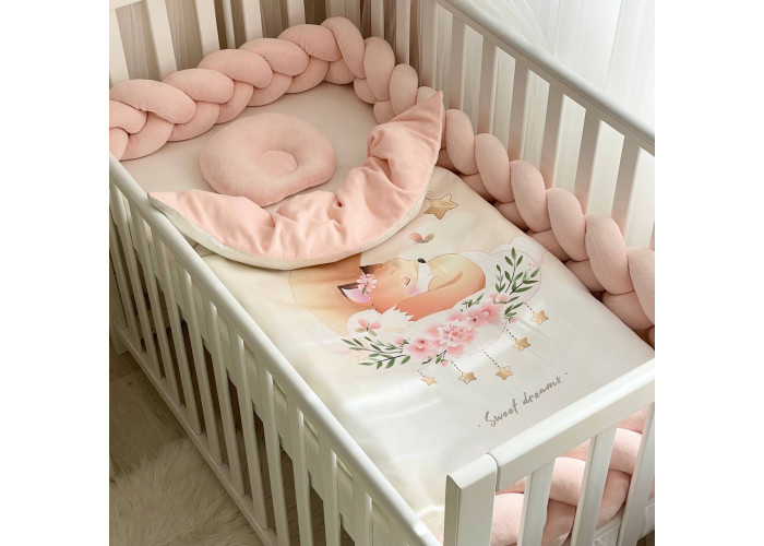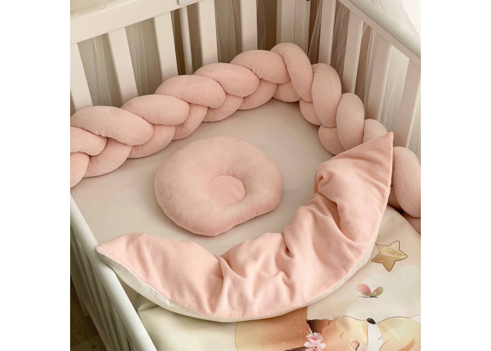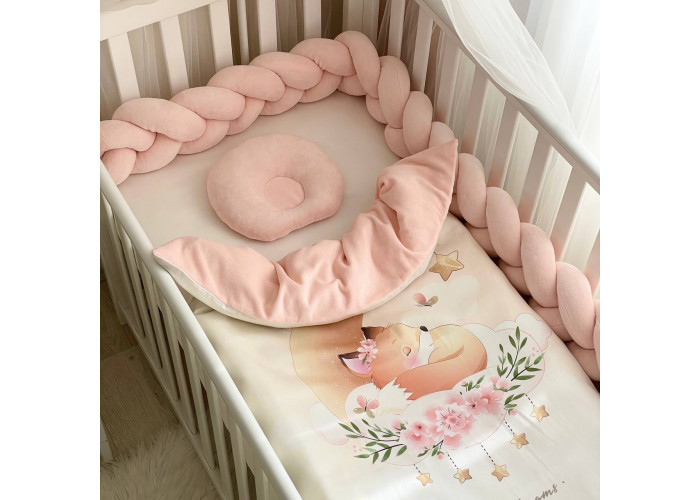 Комплект постільної білизни з 5 предметів (бортик-коса, анатомічна подушка, плед-конверт з ковдрою (сатин/велюр), бантик, простирадло).