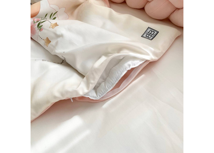 Комплект пошитий з натурального бавовняного матеріалу - сатину. Простирадло на гумці ідеально повторює форму матраца в ліжку. Наповнювач бортика/косички - холлофайбер, наповнювач ковдри - штучний лебединий пух.