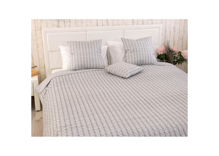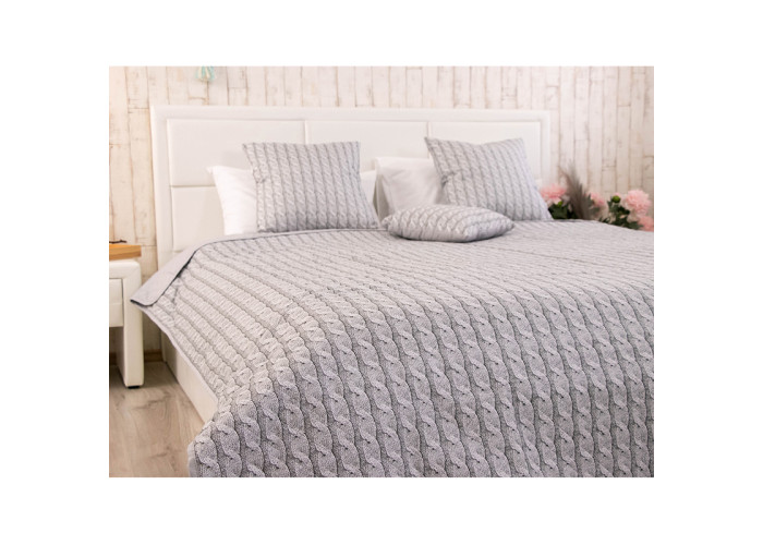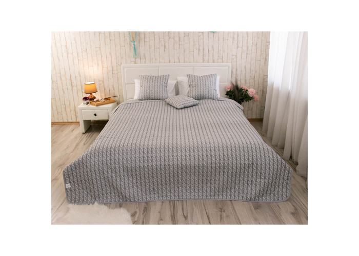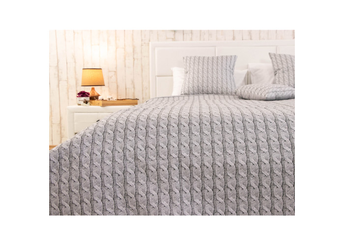 Двостороннє поривало Grey Braid— стильне вишукане, покривало в сірих тонах. Пошито із сучасних матеріалів. Обидві сторони рівноцінні одна із нанесенням малюнка в'язаного полотна, друга однотонно-сірого кольору. Можна застилати за настроєм та створювати цікаву оригінальну атмосферу в кімнаті. А також урізноманітнити інтер'єр. Доповнити покривало декоративними подушками колекції Grey Braid.