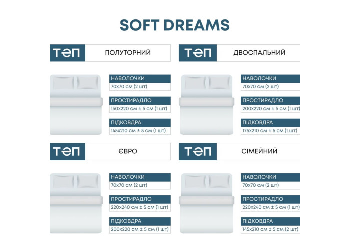 Колекція постільної білизни "SOFT DREAMS" є ідеальним вибором для тих, хто цінує комфорт і зручність відпочинку. Виготовлена з високоякісної бязі, ця базова колекція має багато актуальних дизайнів, щоб задовольнити потреби кожної людини.