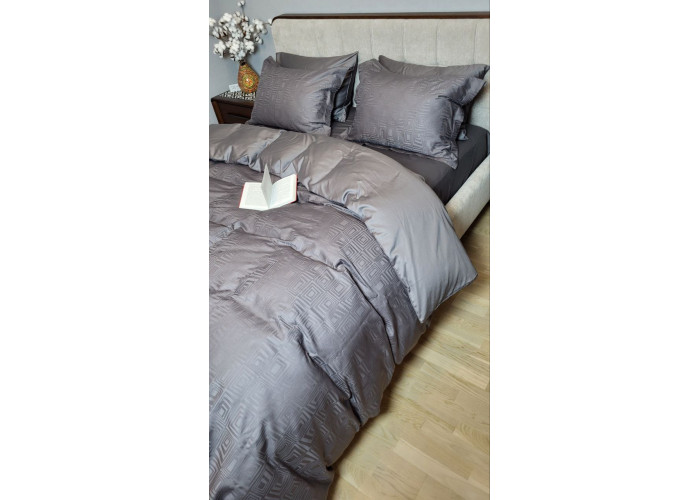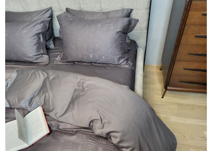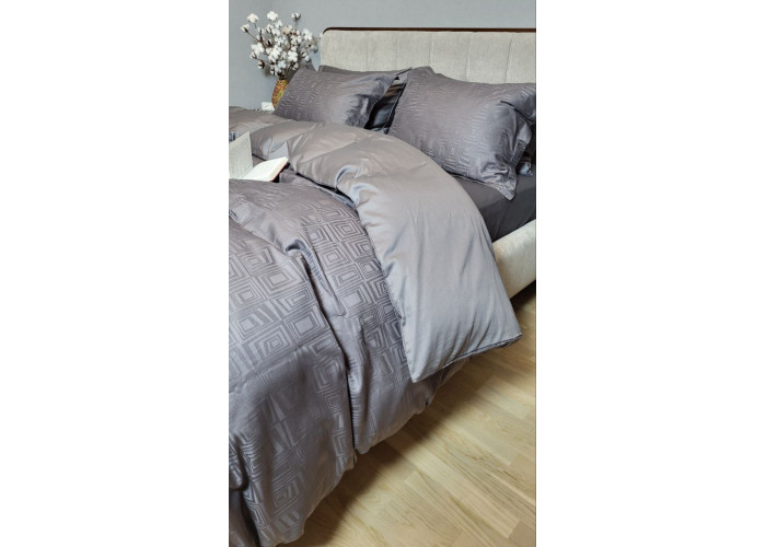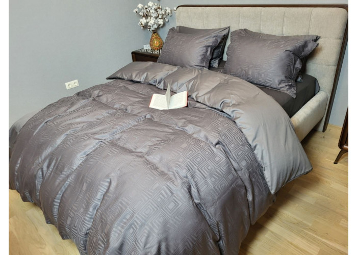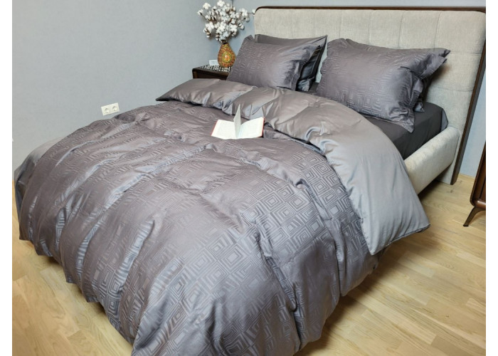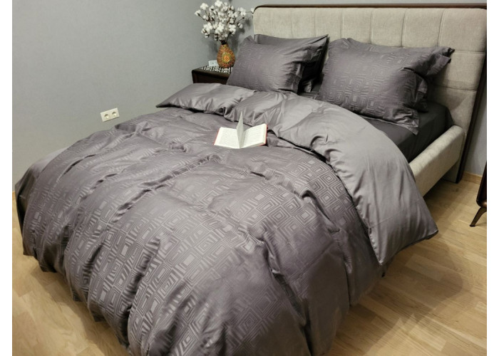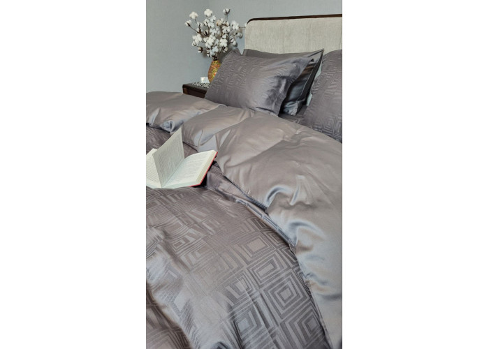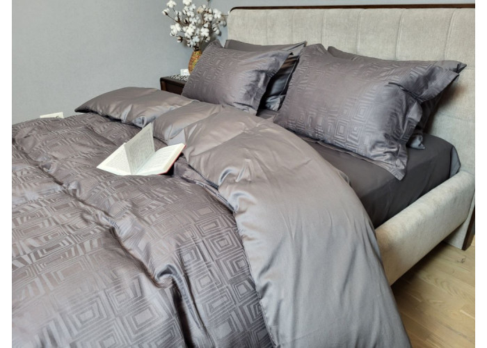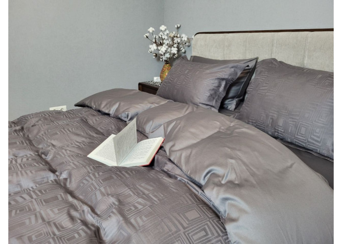 Купити комплект постільної білизни Сатин JACQUARD, SQUARE DARK GREY (Євро на рез.), ковдри та подушки біллербек, та получити найшвидшу консультацію можна по вайберу +380661920048